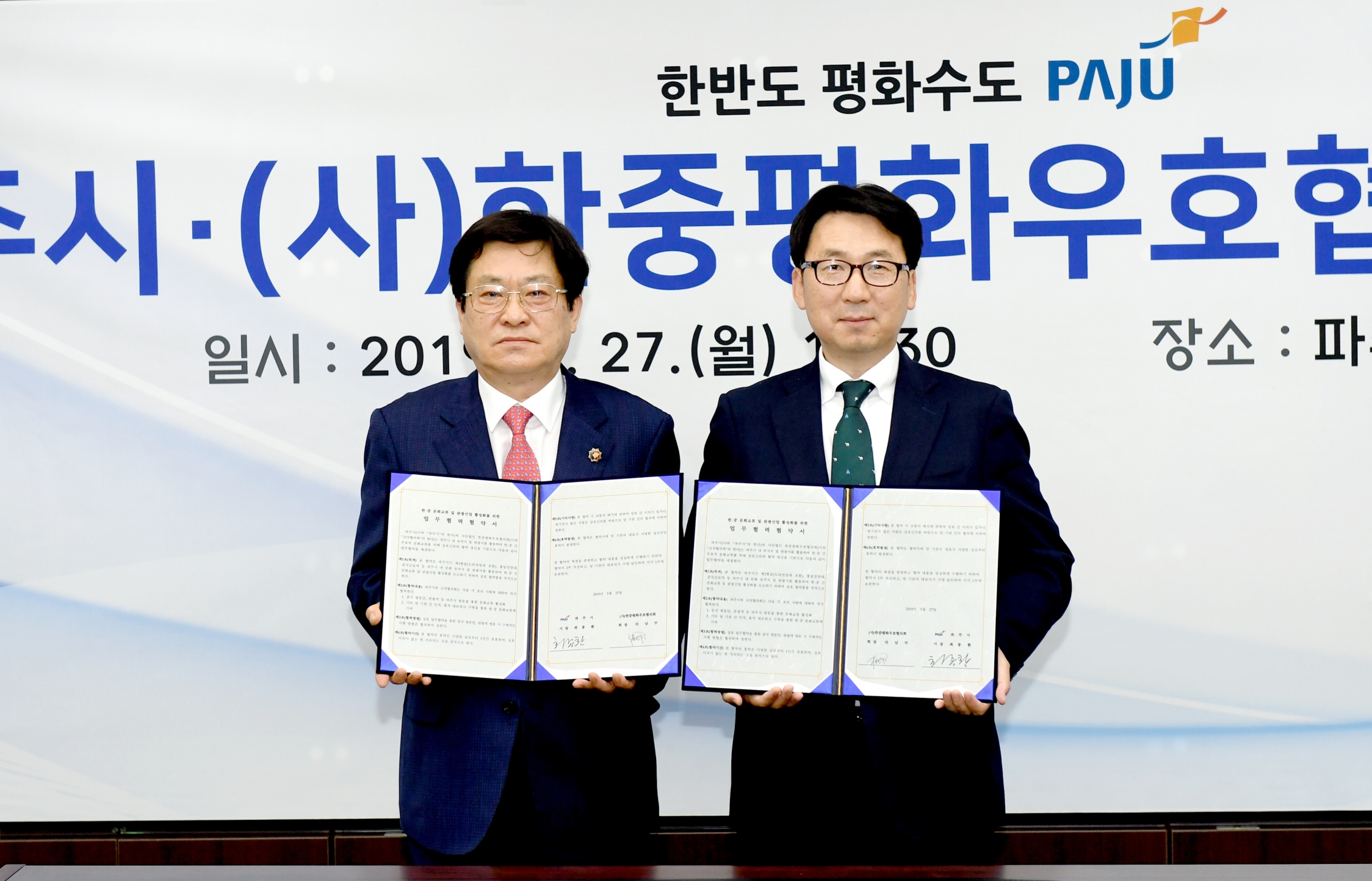 파주시가 27일 한·중 문화교류와 관광산업 활성화를 위해 (사)한중평화우호협의회와 업무협약을 체결했다.
