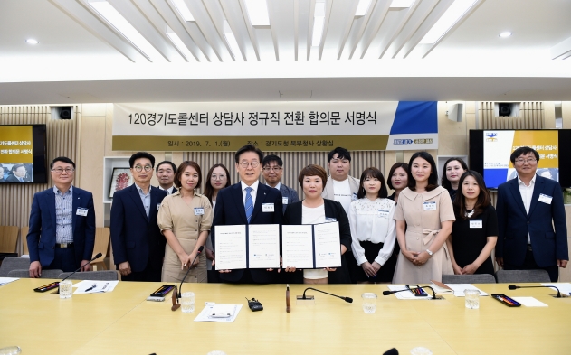 이재명 경기도지사는 1일 오후 경기도 북부청사 상황실에서 박민희 경기도콜센터 상담사 대표와 이런 내용을 담은 ‘120경기도콜센터 상담사 정규직 전환 합의문’에 서명했다.