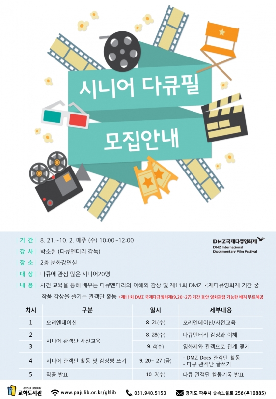파주시 교하도서관은 제11회 DMZ국제다큐멘터리영화제 다큐관객단 시니어 다큐필을 모집해 오는 8월 21일부터 10월 2일까지 6주간 운영할 계획이다.