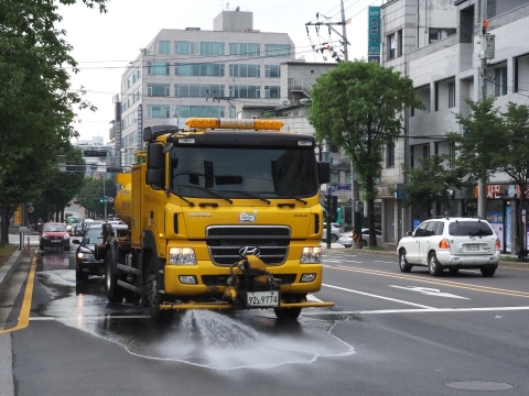 올해 3월초부터 미세먼지 저감을 위한 살수작업을 시작으로 여름철 폭염으로 무더위가 기승을 부리는 기간에도 하루에 18톤의 물을 도로변에 살수하여 도심의 열섬현상을 줄이고 도로면 복사열과 자동차 등에서 발생되는 열로 인한 아스팔트 변형을 예방 하고자 집중 살수작업을 실시하고 있다.
