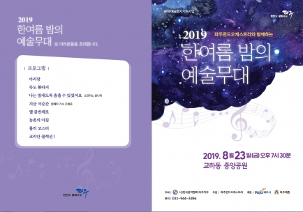 파주시 문화예술 행사지원 사업으로 (사)한국음악협회 파주지부가 주관하는 ‘2019 한여름 밤의 예술무대’가 오는 23일 오후 7시 30분 교하중앙공원에서 파주 윈드 오케스트라 연주로 펼쳐진다.