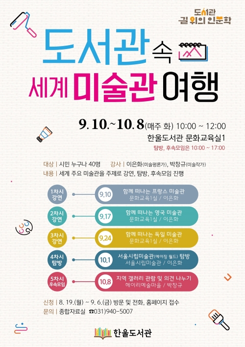 파주시 한울도서관은 오는 9월에서 10월 세계 주요 미술관을 주제로 ‘도서관 속 세계 미술관 여행’ 강좌를 운영한다.
