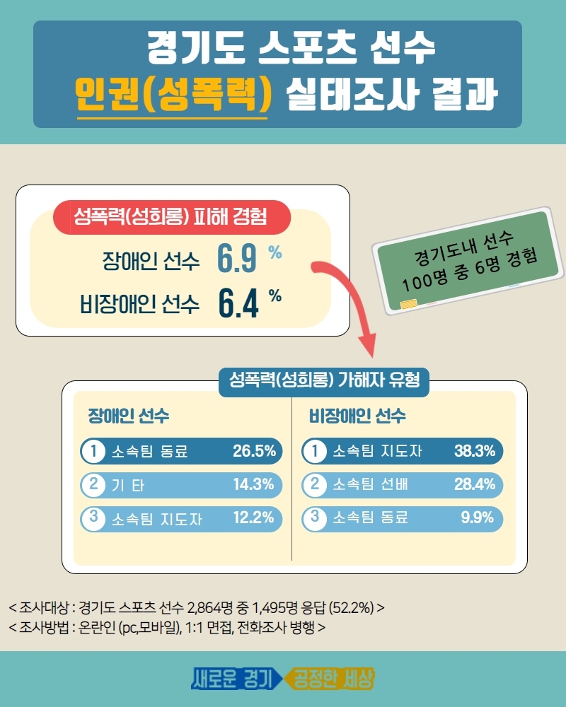 이어 도는 지난 4월 22일부터 6월 21일까지 경기도가족여성연구원이 ㈜케이스탯리서치에 의뢰해 도내 체육단체 소속 선수와 대학·장애인 선수 등 2,864명을 대상으로 온라인 설문조사를 진행했다. 장애인 선수들의 경우 장애유형에 따라 온라인(PC, 모바일), 1:1 면접, 전화조사 등을 병행했다.