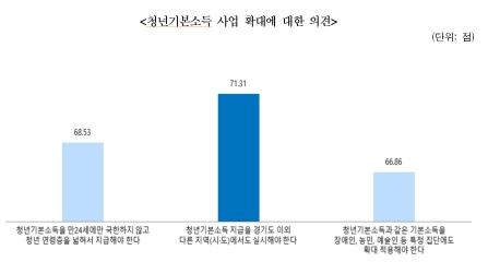 이와 함께 청년기본소득 지급을 ‘경기도 이외 다른 지역에서도 실시해야 한다’는 반응이 71.3점으로 높았으며, ‘연령층을 넓혀서 지급해야 한다’(68.5점), ‘장애인, 농민, 예술인 등 특정 집단에도 확대 적용해야 한다’(66.9점)는 의견도 긍정적으로 나타나 사업 확대에 호의적임을 알 수 있다.