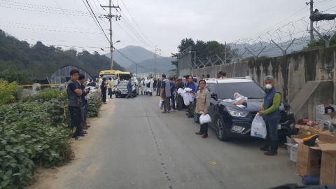 (10월 2일 아침 8시 40분 파평면 마산리. 사진 : 김남중 이사) 살처분을 위해 흰 방역복을 입고 들어갈 준비를 하고 있는 공무원들과 취재진, 주민들이 걱정스러운 표정을 하고 있다.