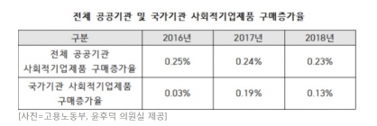 윤후덕 의원이 고용노동부가 제출한 자료를 바탕으로 사회적기업 제품 구매증가율을 분석한 결과 전체 공공기관 및 국가기관의 사회적기업 제품의 전년대비 구매증가율은 오히려 감소했다. 특히 국가기관 구매율은 1%도 되지 않았다.