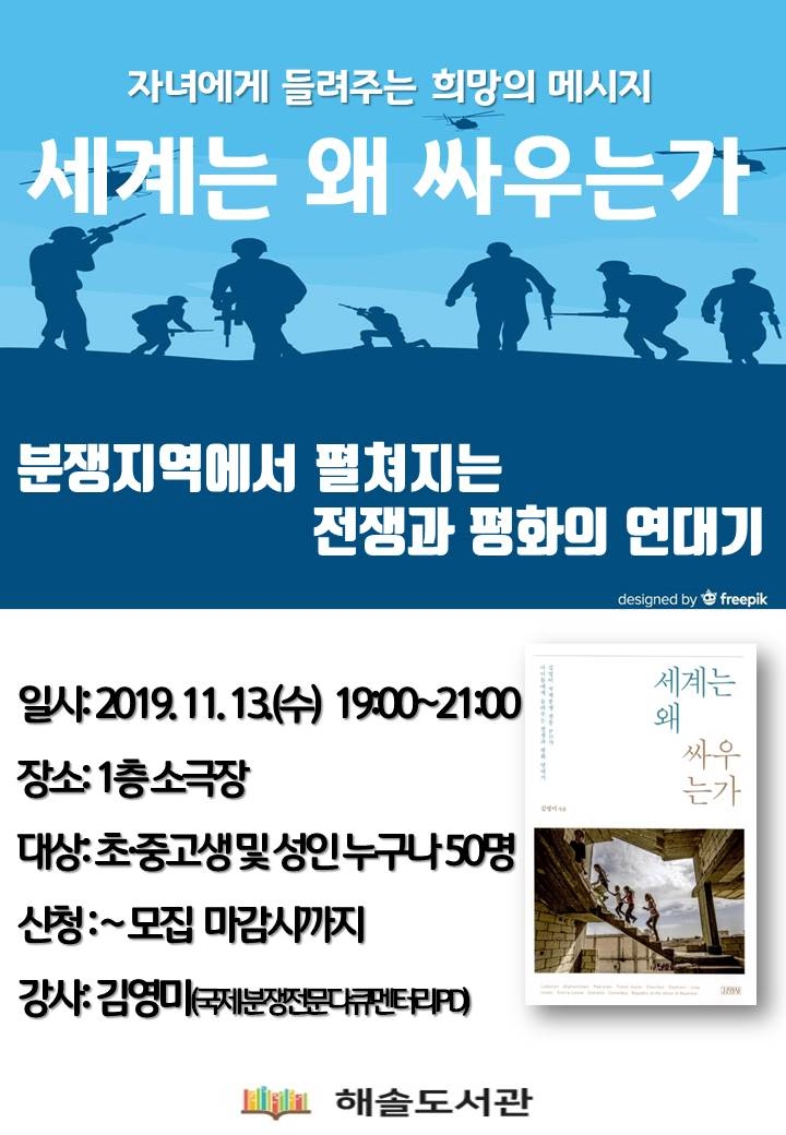 파주시 해솔도서관은 오는 13일 저녁 7시부터 청소년 및 성인을 대상으로 국제분쟁의 진실을 알려주는 ‘세계는 왜 싸우는가’를 주제로 야간 인문강연프로그램을 운영한다.