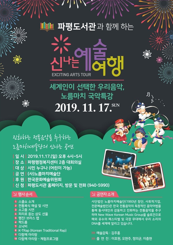 파주시 파평도서관은 오는 17일 오후 4시 ‘신나는 예술여행–세계인이 선택한 우리음악, 노름마치 국악특강’을 개최한다.