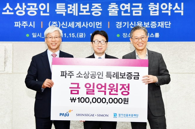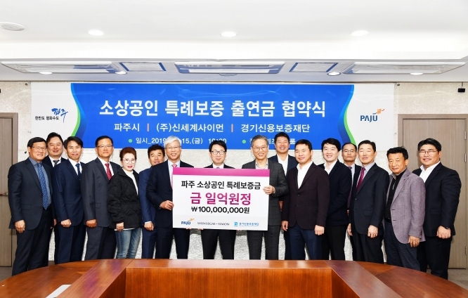 15일 파주시는 대규모 점포인 ㈜신세계사이먼과 협약 체결을 통해 소상공인들을 위한 1억 원의 특례보증 출연금을 이끌어내어 대규모 점포와 지역 내 중소 상인과의 상생발전을 위한 토대를 마련했다. 협약과 동시에 담보능력이 없어 창업에 어려움을 겪거나 경영난을 겪고 있는 소상공인들이 1억 원의 10배수인 10억 원(50여 명)의 대출을 지원받을 수 있게 했다.