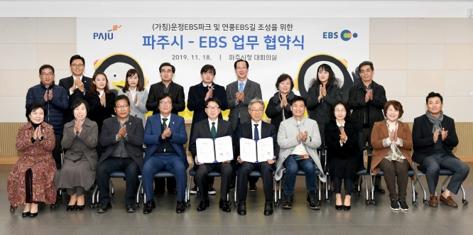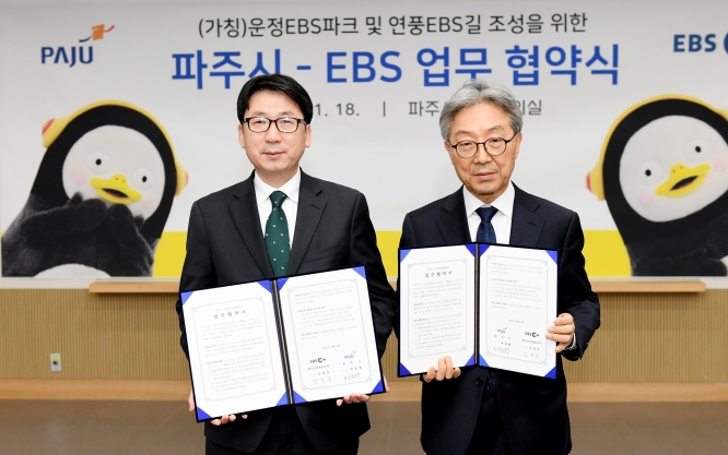 파주시는 18일 시청 대회의실에서 최종환 파주시장, 김명중 한국교육방송공사(EBS) 사장, 시의원 등이 참석한 가운데 운정 유비파크를 어린이 문화체험공간인 ‘(가칭)운정EBS파크’로 조성하고, 연풍리 도시재생사업에 ‘(가칭)연풍EBS길’을 구현하기 위해 EBS와 협약을 맺었다.