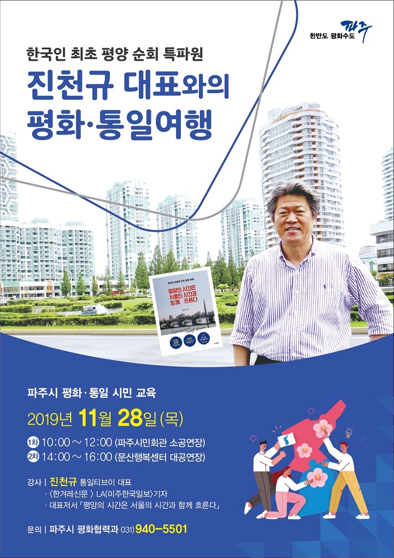 파주시가 오는 11월 28일 진천규 통일TV대표를 초청해 ‘파주시민과 함께하는 평화·통일 여행’을 주제로 교육을 실시한다.