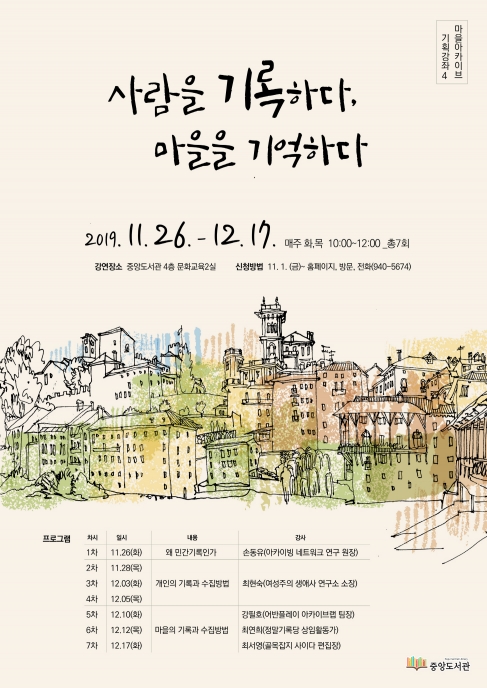 파주중앙도서관은 ‘사람을 기록하다, 마을을 기억하다’라는 주제로 11월 26일부터 12월 17일까지 4번째 마을아카이브 기획 강좌 총 7강 진행하고 있다.