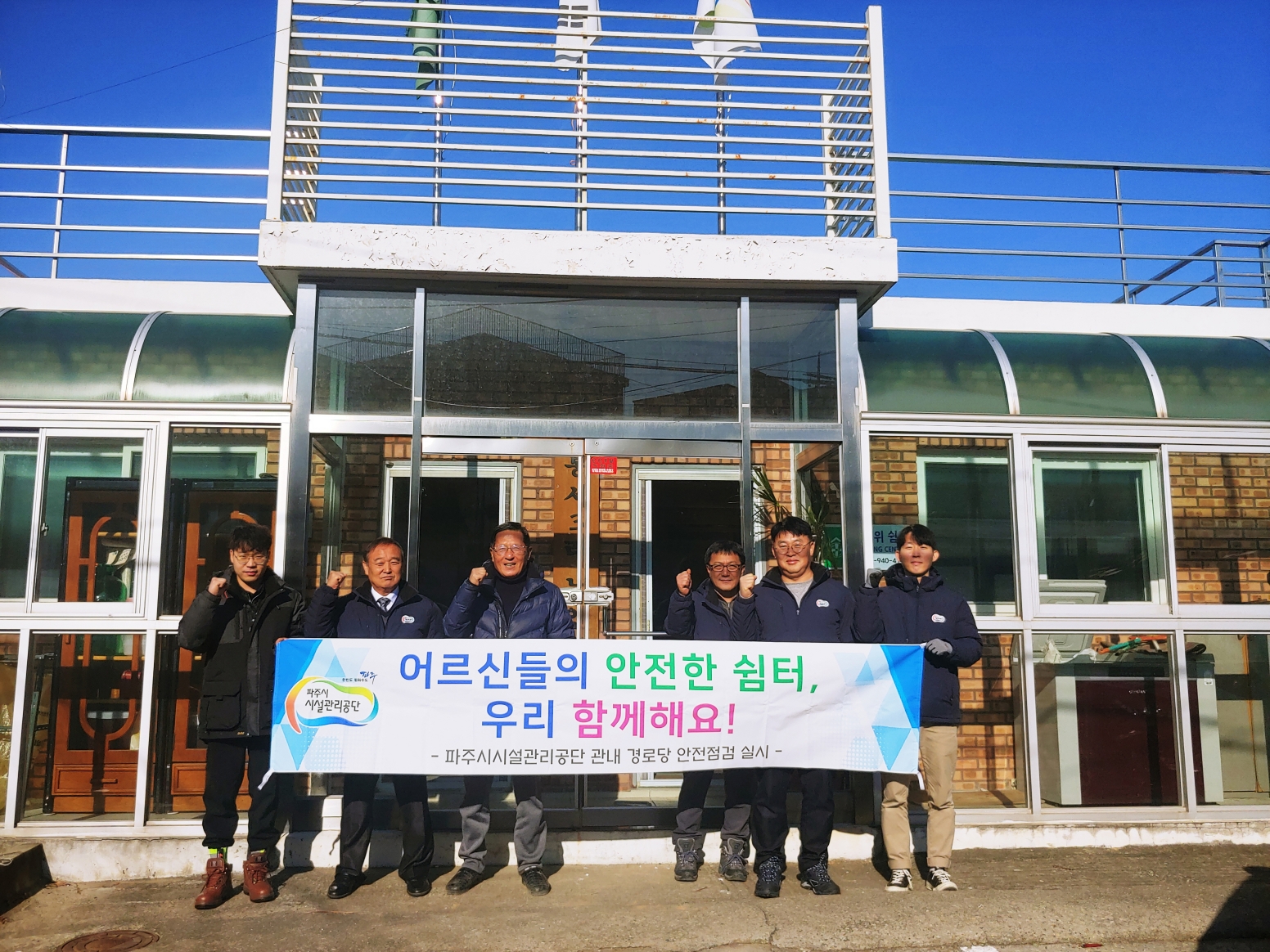 파주시시설관리공단은 지난 12월 6일 봉서3리 경로당 안전점검을 전기, 기계, 안전, 건축직 기술직원이 참여한 가운데 올해 세 번째 실시하였다. 공단은 대한노인회 파주시지회와 맺은 업무협약 내용을 기반으로 기술 분야별(건축, 기계, 전기, 소방, 산업안전) 안전점검단을 구성하여 지난 8월부터 경로당 안전점검 활동을 추진해왔다.