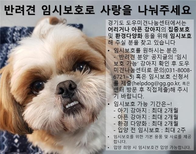 임시보호제 참여 등 자세한 사항은 경기도 도우미견나눔센터 인터넷 카페(cafe.daum.net/helpdogs)를 참고하거나 전화(031-8008-6721~5)로 문의하면 된다.