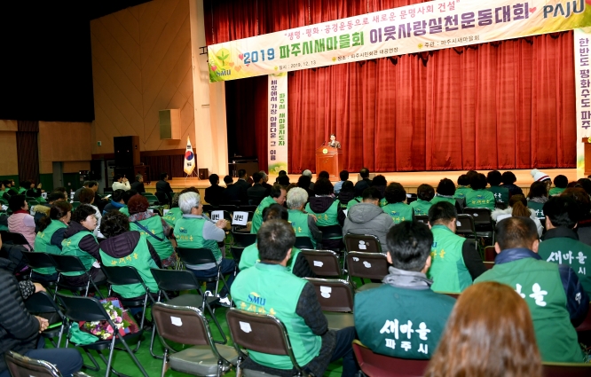 파주시 새마을회는 13일 시민회관 대공연장에서 최종환 파주시장, 손배찬 파주시의회 의장을 비롯한 새마을 지도자 500여 명이 참석한 가운데 2019년 새마을회 이웃사랑 실천 운동대회를 개최했다.