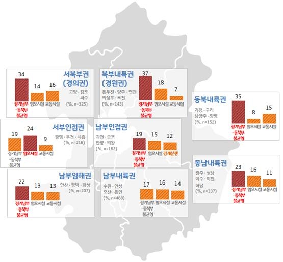 경기도내 갈등 현안 중 ‘가장 시급하게 해결해야 할 문제에 대한 물음’에는 1순위로 ▲경기 남부와 동북부 간 발전의 불균형으로 인한 갈등(24%)을 꼽았다. 경기도를 8개 권역으로 나눠봤을 때, 7개 권역에서 1순위로 나타났다.
