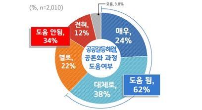 이러한 공공갈등 해결방안으로 도민들이 함께 논의하고 토론해 정책대안을 마련하는 ‘공론화 과정’이 도움될 것이냐는 물음에 도민 62%가 동의했다.