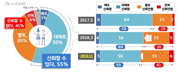특히 이 수치는 매년 감소세로, 2017년 70%에 달했던 긍정 응답은 2018년 60%를 거쳐 2019년 55%까지 3년간 15%p나 감소했다. 도민사회가 점점 ‘신뢰할 수 없는 사회’가 되고 있다는 방증이다.