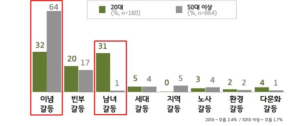 이 중 ▲남녀갈등 부문에 있어 20대와 50대 이상의 응답을 비교해봤을 때 20대는 31%가 심각하게 인식한 반면 50대 이상은 단 1%에 그쳐 세대별 시각차가 뚜렷하게 나타났다. 그러나 ▲빈부갈등에 대해서는 20대와 50대 이상에서 각각 20%, 17%로 나타나 경제문제에 대해서는 비슷한 시각을 보였다.
