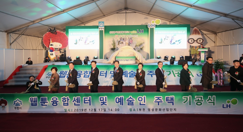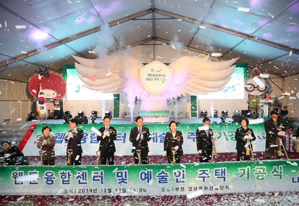 ‘부천 웹툰융합센터 및 예술인임대주택 기공식’이 17일 부천영상문화산업단지 일원에서 이재명 경기도지사, 김현미 국토교통부 장관, 박양우 문화체육관광부 장관, 장덕천 부천시장 등의 내빈을 비롯해 웹툰 관련 작가와 예술인 등 300여명이 참석한 가운데 개최됐다.