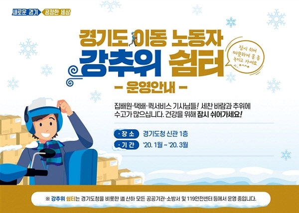 경기도가 집배원, 택배노동자 등 겨울철 한파에 취약한 이동노동자를 위해 올해 1월부터 3월 30일까지 경기도청사와 공공기관에 ‘이동노동자 강추위 쉼터’를 마련해 운영한다고 밝혔다.