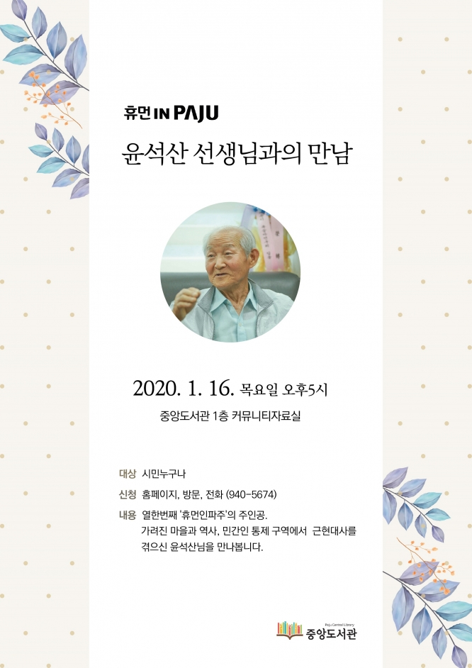 파주중앙도서관, 휴먼 IN PAJU 전시 및 강연 개최 - 한국 근현대사의 산 증인 윤석산 선생님과의 만남