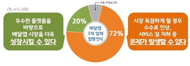 조사결과에 따르면 최근 ‘배달의 민족’, ‘요기요’, ‘배달통’ 3개 업체 합병 이슈에 대해 ‘시장을 독점할 경우 수수료 인상, 서비스 질 저하 등의 문제가 발생할 수 있을 것’이라는 응답이 72%에 달했다. ‘우수한 플랫폼 바탕 배달앱시장이 더욱 성장할 것’이라는 의견은 20%에 그쳤다.