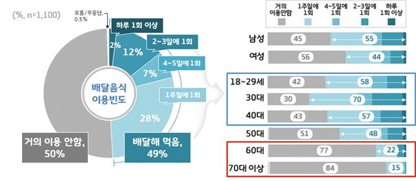 도민 절반(49%)이 주1회 이상 배달음식을 이용하는 것으로 나타났다. 응답자의 70%가 배달앱을 이용해 음식을 주문한 적이 있었으며, 특히 2030층의 이용률은 90%에 달했다.