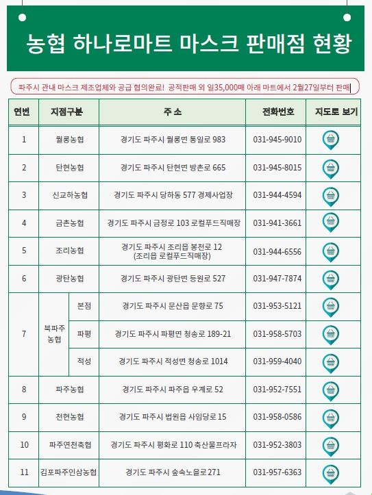 파주시는 27일과 28일에는 하루에 마스크 1만1천 개씩 총 2만2천 개를 하나로마트 등 13개 판매처에 나눠서 판매하고 주말부터는 하루에 3만5천 개씩 매일 13개 판매처에서 판매할 계획이다. 마스크 공급량이 많지 않아 당분간 1인당 판매수량은 제한된다. 현재 정부가 특단의 대책으로 국내 생산량의 50%인 약 500만 개를 매일 약국, 하나로마트, 우체국, 공영홈쇼핑에서 판매하기 때문에 마스크 수급조절과 가격안정화가 이뤄질 것으로 전망된다.