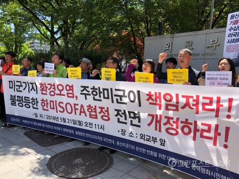 <자료 사진> 주한미군기지 대책 관련 시민단체들이 2018년 외교부앞에서 '미군기지 환경오염 주한미군 책임촉구'기자회견을 열었다(출처 - 그린포스트 코리아)