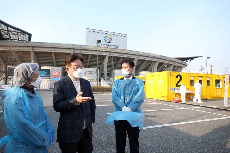 이재명도지사가 경기도 드라이브스루 검사센터를 방문하여 점검하고 있다.