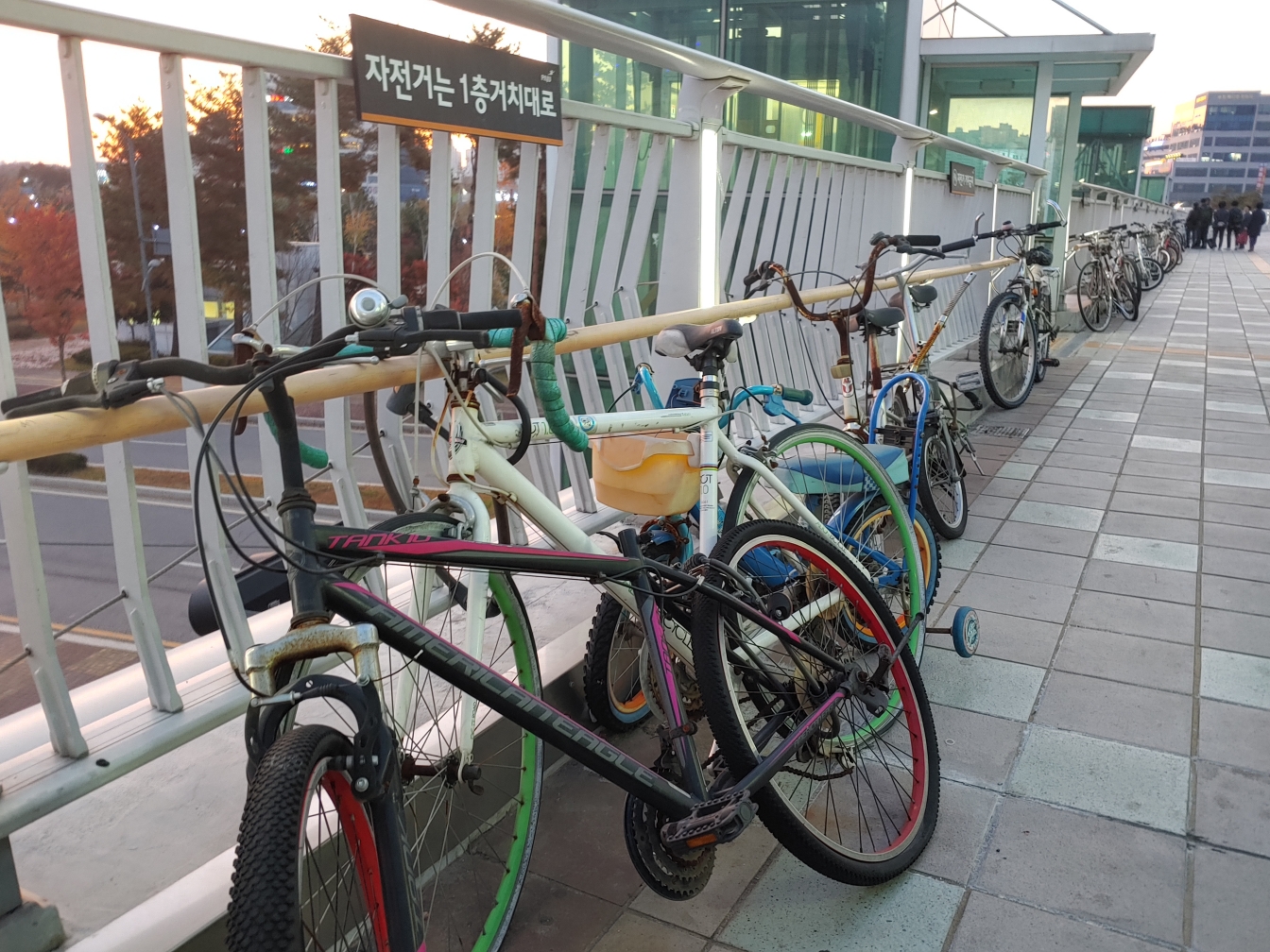 ▲ 현재 지상이 아니라 긴 육교를 이용하는 시민들이 2층 출입구에 자전거를 거치하고 있다.