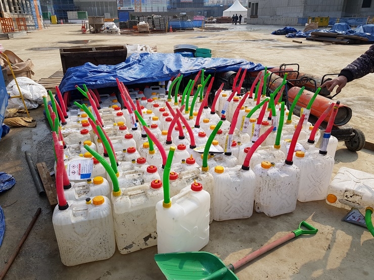 경기도 A 아파트 공사장의 경우 제2류 위험물인 고체연료를 최소 허가수량(1,000kg)보다 48배 초과(48,000kg/3,840통)해 저장․사용하다가, B 아파트 공사장은 최소 허가수량(1,000리터)보다 35배 많은 열풍기용 등유 3만5,430리터를 불법으로 저장․사용하다 적발됐다.