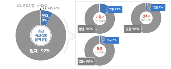 이러한 인식을 반영하듯, 최근 예배·법회·미사 등 종교집회에 참여한 경험이 있는 종교인은 8%에 불과했다. 종교별로는 천주교인 1%, 불교인 2%로 매우 낮았으며, 개신교인은 13%인 것으로 조사됐다.