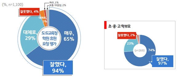 경기도와 도교육청의 학원 휴원 요청에 대해서는 도민의 94%가 ‘잘했다’고 평가했다. 특히 초·중·고등학교 학부모들의 긍정적 평가는 97%로 더 높았다. 경기도와 도교육청은 앞서 6일 도 소재 학원 및 교습소에 대해 휴원 요청을 하고, 청소년들에게는 학원·교습소·PC방·노래방·독서실 등 다중이용시설 이용을 자제할 것을 요청한 바 있다.