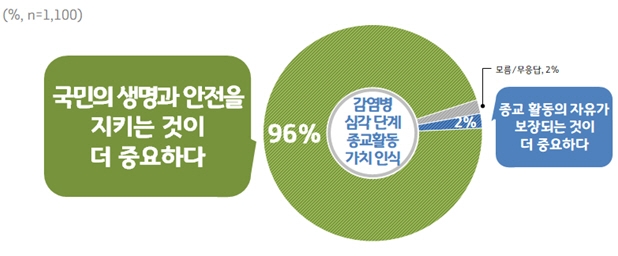 - 감염병 위기경보 심각 시‘종교활동의 자유 보장’(2%)보다 ‘국민의 생명과 안전’(96%)이 더 중요