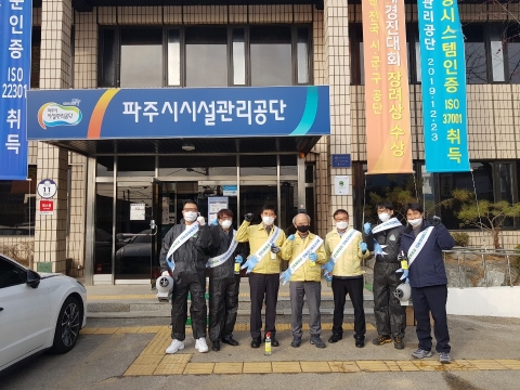 이번 방역활동은 파주시시설관리공단 직원들로 구성된 자원봉사단을 결성하여 시민들이 이용하는 다중이용 시설과 버스승강장, 기차역 주변, 상가 밀집 지역을 중심으로 사람들의 접촉이 많은 출입문과 손잡이, 입구 등을 중점적으로 방역소독을 실시하였고