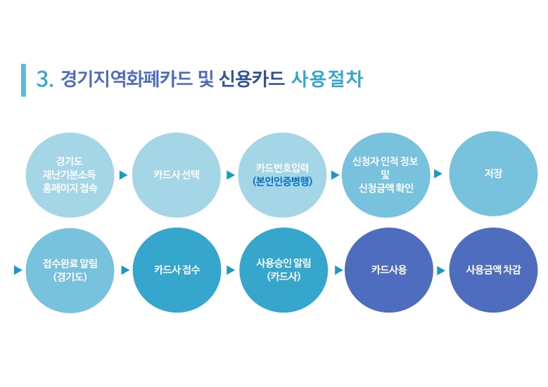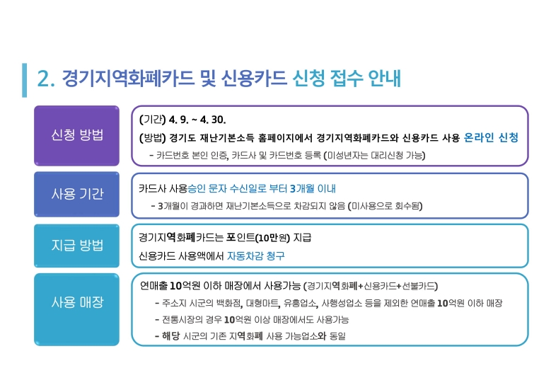 경기도는 현재 하나, 우리, 국민, 신한, 삼성, 비씨, 롯데, 수협, 농협, 기업, 한국씨티, SC제일, 현대 등 13개 카드사들과 협의를 완료했다. 신청이 완료된 신용카드로 재난기본소득을 사용하면 3~5일 이내에 사용 확인 안내 문자를 받게 된다.