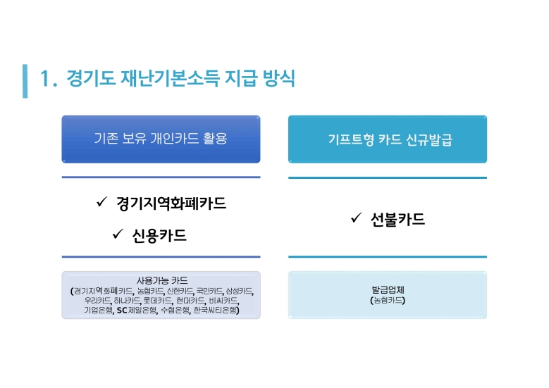 지급 방식은 자신이 사용하는 경기지역화폐카드나 신용카드를 이용해도 되고, 카드가 없는 사람은 가까운 읍·면·동 행정복지센터 또는 농협 지점을 찾아 선불카드를 신청해도 된다. 어렵거나 불편해서 경기도 재난기본소득을 받지 못하는 일이 없도록 하겠다는 것이 경기도의 설명이다.