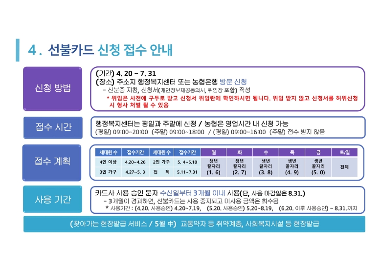 해당 주 대상자 중 선불카드를 신청하지 못한 도민은 토요일과 일요일 읍‧면‧동 행정복지센터에서 신청하면 된다. 주말 뿐 아니라 직장인을 배려해 주중에는 행정복지센터는 오후 8시까지, 토요일과 일요일은 오전 9시부터 오후 6시까지 신청을 받는다. 농협 지점은 평일 오전 9시부터 오후 4시까지 신청 가능하다. 5월 18일 이후부터는 가구 수 관계없이 평일 정상업무시간 내에 읍면동 행정복지센터나 농협에서 발급받을 수 있다.