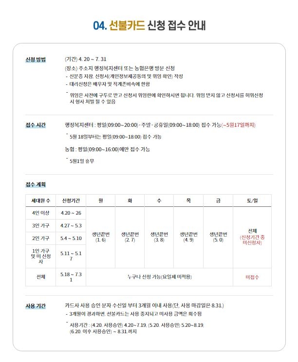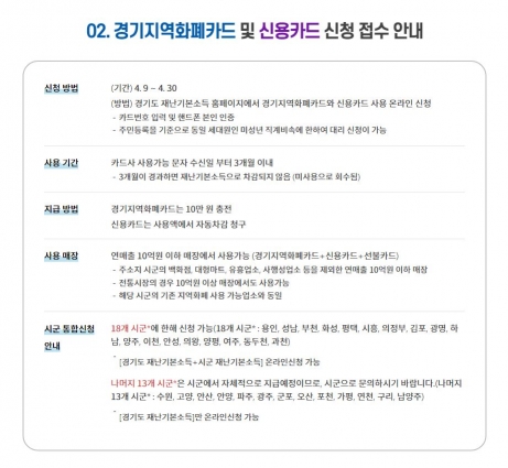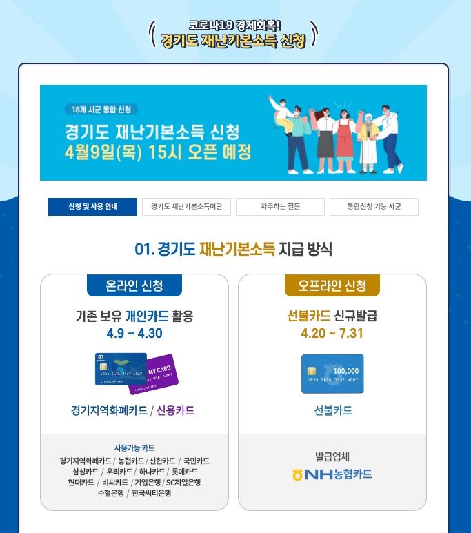 한편 경기도 재난기본소득 홈페이지를 통한 온라인 신청은 오는 30일까지 진행된다. 오는 20일부터는 거주지 읍면동주민센터와 농협 지점에서 선불카드를 발급한다.