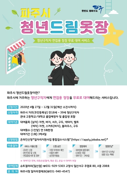 파주시는 오는 4월 27일부터 파주시 청년구직자의 경제적 부담을 줄이고자 면접정장을 무료로 대여해주는 ‘파주시 청년드림옷장’ 사업을 추진한다.