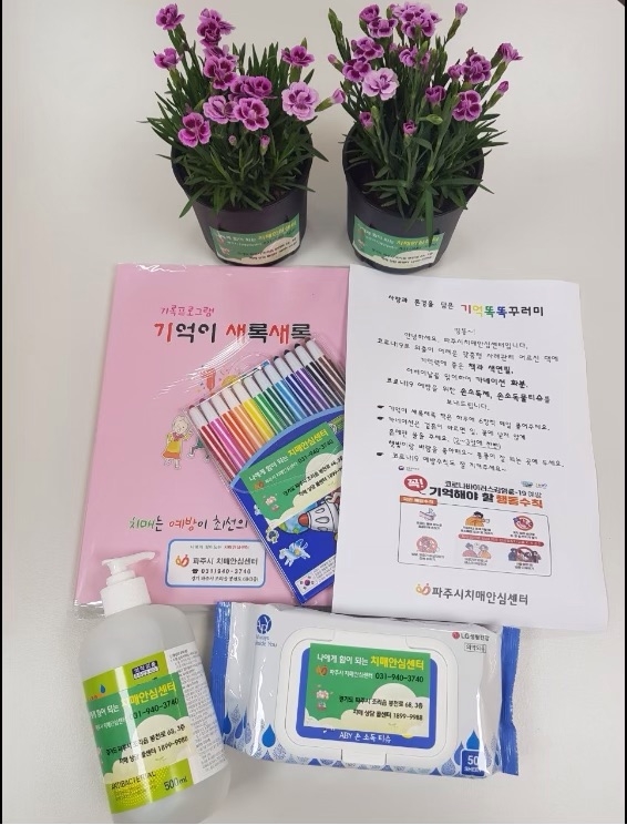 기억똑똑 꾸러미는 인지활동을 위한 인지재활워크북, 필기구와 어버이날을 맞이해 카네이션 화분, 코로나 관련 개인위생물품으로 손소독제와 소독물티슈로 구성됐다.