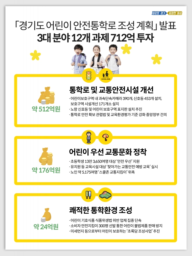 이에 도는 올해 ‘어린이 등하굣길이 안전한 경기도 실현’을 목표로, ‘통학로 안전시설 대폭 개선’, ‘교통안전 의식 개선’, ‘학교 주변 유해요소 제거’ 등 3대 분야 12개 과제를 추진한다. 사업비는 각각 512억 원, 176억 원, 24억 원씩 총 712억 원이 투자될 예정이다.