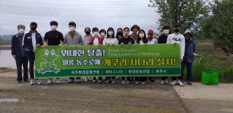 이번 월롱 농경지에 설치한 개구리 사다리는 파주환경운동연합 회원들과 문산수억고 환경동아리 ‘해바라기’학생들이 참여했고, 환경운동연합과 파타고니아, 파주시의 도움으로 진행했다. 농어촌공사 파주지사와도 긴밀한 협의를 거쳤다. 파주환경운동연합은 이번에 시범 설치한 곳에 대해 일정기간 모니터링을 하고 이미 설치한 다른 지역의 모니터링 결과도 반영하여 확대 설치할 계획이다.