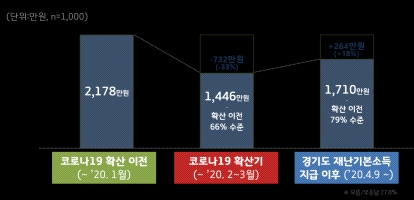 - 경기도 재난기본소득 지급 이후, 코로나19 이전 매출액 79%까지 회복… 코로나19 확산기였던 2~3월 대비 월매출 18% 증가
