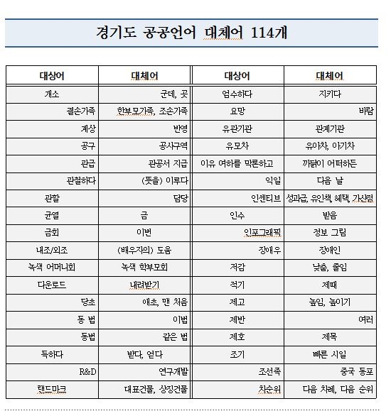 이를 추진하기 위해 경기도는 지난해 발표한 ‘경기도 공공언어 대체어 114’를 정비 대상에 우선 적용할 방침이다. 도는 일본어 투, 어려운 한자어, 외국어․외래어, 차별적 용어 등 4개 분야에서 개선이 필요한 공공언어 114개를 선정해 대체어를 사용토록 권고하고 있다.
