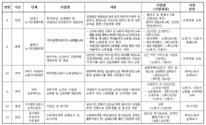 이 밖에도 5인 미만 사업장 노동자 권리구제 사업(수원-수원시노사민정협의회), 공동주택 종사자 조사연구 및 좋은 일자리 상생모델 개발(부천-부천시비정규직근로자지원센터), 찾아가는 중소기업 노동자 권익 상담(화성-화성시노사민정협의회), 찾아가는 소상공인 산업재해 예방교육(평택-평택시노사민정협의회) 등을 비롯한 8개 사업이 함께 추진될 예정이다.