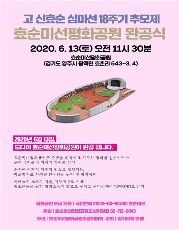 효순미선평화공원조성위원회가 시민기금으로 조성하는 효순미선평화공원은 지난해 13일 착공식을 진행했으며 1년 만에 완공된다. 사고현장인 양주시 광적면 효촌리 367㎡ 규모로 조성되는 공원은 청소년을 위한 평화교육의 장으로 활용될 예정이다.