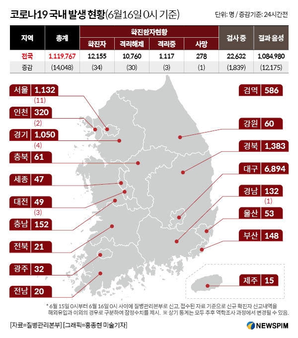 ▲국내 코로나 발생 현황 6월 16일 0시 기준(자료출처 : 뉴스핌)